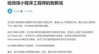 18 日下午支付宝小程序团队在知乎上发布了《给微信小程序工程师的致歉信》,在该信中,支付宝对于自己的直接 copy 了微信的示例行为表示道歉,表示已经立即修改。