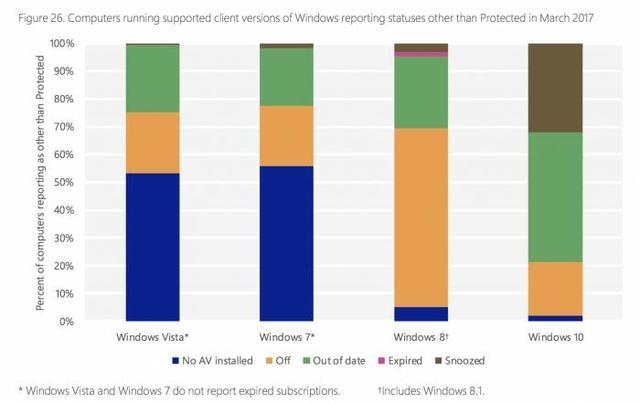 在其最新的安全情报报告中,微软透露,在所有 Windows 7 电脑当中有一半以上未安装任何反病毒软件。从 Windows 8 开始,微软决定在没有其他反恶意软件存在的情况下默认启用 Windows Defender,尽管如此,大多数未受保护的 Windows 8 和 Windows 8.1 PC 都会关闭其反恶意软件。