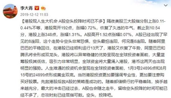 去年12月12日,李大霄微博放狠话:“港股现人生大机会。阿里巴巴和腾讯将会形成双龙头,港股将以异常稳健的优势呈现在全球投资者面前。”