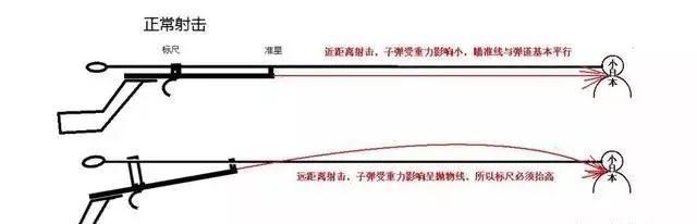 另一种是不调表尺,计算好弹道下落所需要的补偿高度,直接瞄着目标上方射击,比如事先计算好子弹飞到1000米处弹道下降5米,就直接瞄着目标上方5米射击。