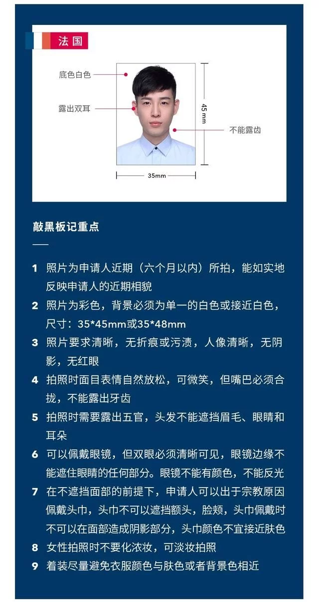 就以对照片要求严格的法国为例,帮大家整理出一份申根国家签证照的注意事项。
