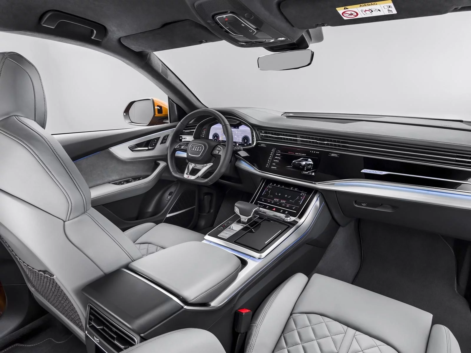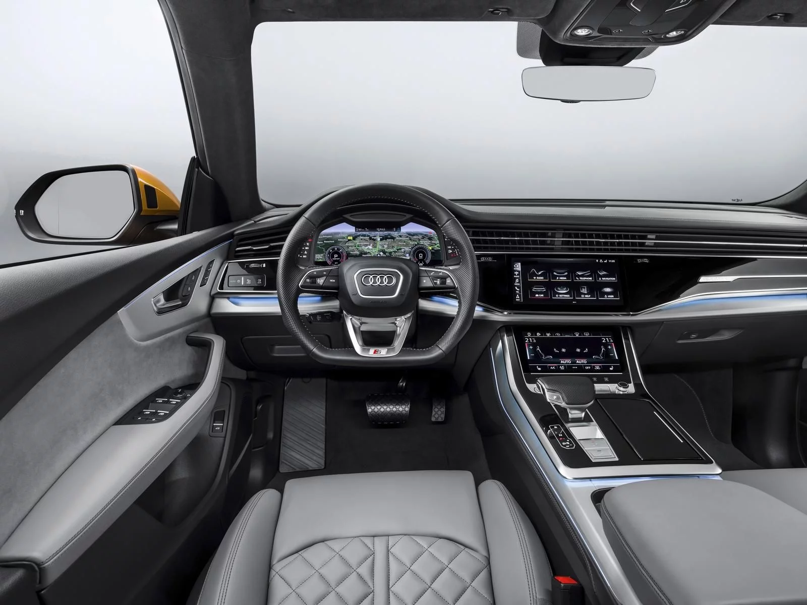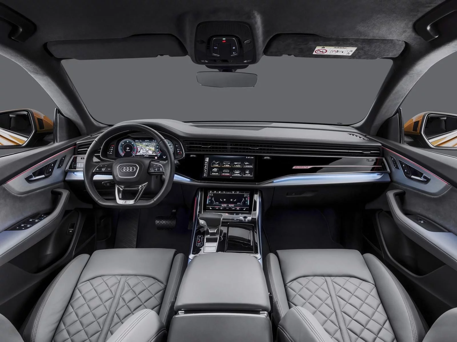 内部显然是基于Q7设计,但它有一个令人印象深刻的数量独特的特点。连续的空调出气口带放置在仪表板的顶部,这是我们迄今为止已经看到的奥迪一个设计元素,但下半部分是采用黑色完成,使内饰显得更加豪华。更重要的是,中控台匹配信息娱乐屏幕,留下最深的印象是整个破折号是一个大显示器。底部的蓝色环境照明进一步增强了这种效果。