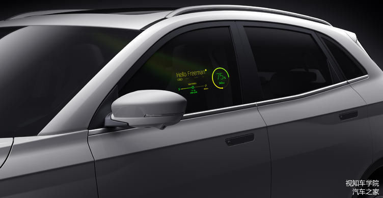 驾驶员的侧车窗上还带有交互界面,能显示充电时间、续航里程、剩余电量等信息,也可以与手机互联,显示车主的行程安排、路线等。这东西看着比HUD抬头显示还酷,顺带着能治司机的颈椎。