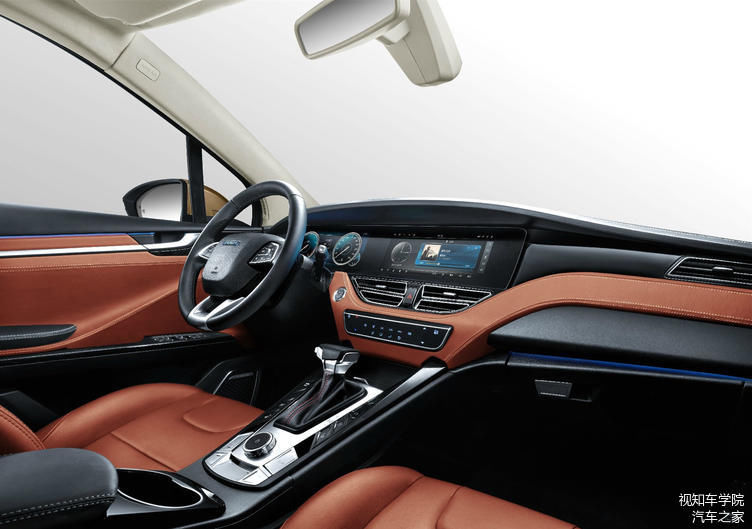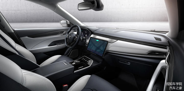 内饰设计简洁,液晶仪表盘和中控大屏几乎成了新能源汽车的标配,平底方向盘则保留了一定运动基因。