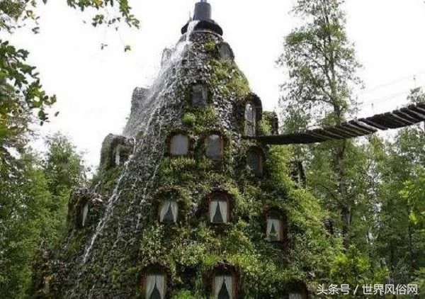 魔术山旅馆位于智利河大区一片私人的卉罗卉罗生物保护区(Huilo Huilo Biological Reserve),整个酒店依山而建,酒店的外形更像是一座中世纪的古塔。外形模仿火山形状建造,石块表面布满了青苔和蔓藤,和周围的森林融为一体,让人仿佛置身于真正的火山里面一般,尽可以满足每个人的童话与魔幻旅行美梦。旅馆顶部的装置可以喷出大量的水,像瀑布一样流过每一个窗户,有时会恍惚是在“水帘洞”中一般。
