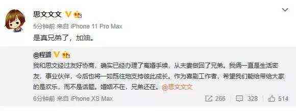 “婚姻不在,兄弟还在”,把夫妻过成兄弟的思文,说过的话成真了!——引言 7月23日,脱口秀演员程璐发文宣布与思文离婚。 程璐在离婚声明里称:“我和思文经过友好协商,确实已经办理了离婚手续,从夫妻做回了兄弟。”并表示今后也将一如既往地支持彼此成长,“婚姻不在,兄弟还在。” 思文转发了程璐的动态,并且表示:“是真兄弟了,加油!” 程璐的声明一出,网友都傻了。 “我的天、傻眼了、爷青结”,这三个词应该是大部分喜欢思文程璐这一对“脱口秀夫妻”的吃瓜群众看到这一消息的第一反应。 “独立女性”和“软饭男”的段子不复存在了! 也有很多明白人,早有预感程璐思文会掰,因为看《脱口秀大会》的时候,看到海源跟思文坐在一起,程璐单独坐就觉得很奇怪了,因为通常程璐和思文都会坐在一块,再加上程璐讲的段子也是跟离婚有关的,还说了一句经典的“吵架吵赢了,但是家没了”!