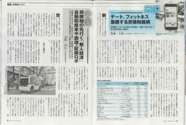 “高楼林立的大道上,一辆小型配送车缓缓穿行而过。这是在中国拥有200多家连锁店的‘小恒水饺’用于外卖送餐的无人车......” 近日,日本《周刊经济学人》(2020.7.14)刊载日本《每日新闻》中国总局记者赤间清广的文章,如此描述北京国贸大街的日常一幕。文章指出:迄今为止,中国在快递等行业试行过“无接触服务”,此次疫情下(“无接触服务”)市场需求剧增,推动着相关技术水平更上一层楼。该篇题为《走在“无接触服务”前沿的“无人经济”:无人驾驶防疫车和烹饪•配菜机器人》的文章表示,在最先受新冠疫情冲击的中国,各类先进的“无接触服务”正步入实用化阶段。文章列举深圳公园内的“无人驾驶警务车”、浙江省社区内提供消毒、测温服务的“无人驾驶防疫车”等,称疫情期间,随着民众“无接触服务”需求的激增,来自各地的新订单正大量流入无人驾驶汽车行业。 文章表示,早在疫情蔓延之前,“无人化”“无接触服务”便在中国形成热潮。扮演先行者角色的是中国的互联网企业和高新技术产业。他们一度苦恼于随中国经济增长而高涨的人工费。一些处于试行阶段的(无人)店铺和服务正走向实用化阶段。 文章介绍,2018年年底,阿里巴巴旗下首家由机器人提供客房清洁、调酒等服务的酒店——“菲住布渴”正式开业。京东集团亦推出由机器人烹饪、配菜的无人餐厅,并在部分地区开始使用无人机和无人驾驶汽车进行物流配送。文章表示,以疫情为契机,这些前期积累的技术经验一下子结出了丰硕成果。