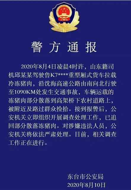 日前,江苏东台市部分群众哄抢货车散落猪肉一事引发关注。8月10日,东台市委宣传部在其官方微信公众号发布致歉消息称“对于这件事的发生除了遗憾,我们更深深自责”。