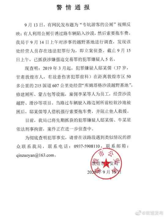 此前报道 14日,有网友反映,甘肃敦煌一景区现“专坑游客公厕”,厕所建在沙土上,游客开车过来后车辆被陷,工作人员再索要巨额拖车费。