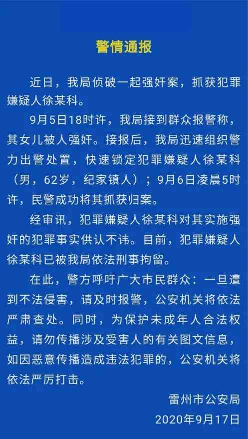近日,湛江雷州市六旬男子徐某科强奸邻居家8岁女童一事引发网络热议。 女童亲属陈芳(化名)告诉南方+记者,除了该名8岁女童外,另有一名12岁女孩子被性侵,“他们被徐某科性侵了三四年,一直没拍下证据”。徐某科亲属则称,徐某科常和邻居家两女两男四个孩子玩耍,强奸“可能是恶作剧”。 17日晚,雷州警方通报称,犯罪嫌疑人徐某科(62岁,纪家镇人)对其实施强奸的犯罪事实供认不讳,目前,其已被依法刑事拘留。