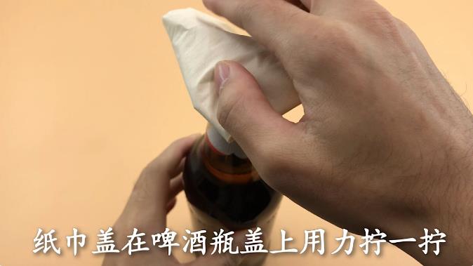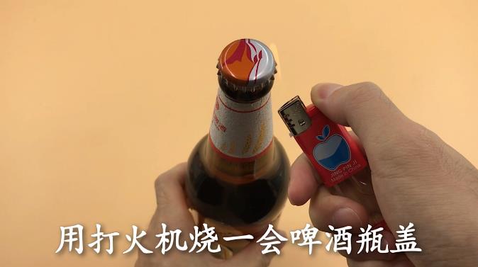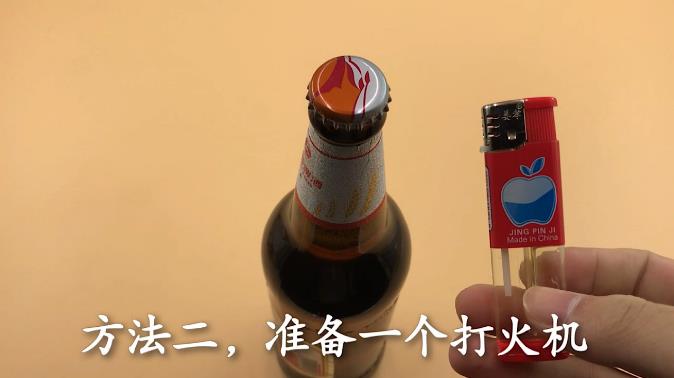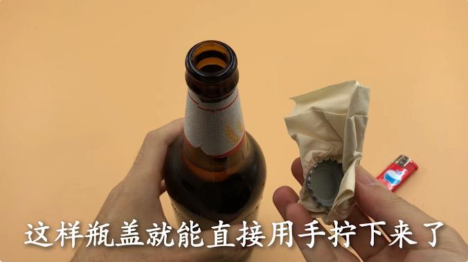 方法二,准备一个打火机 用打火机烧一会啤酒瓶盖,这个就是利用了热胀冷缩的原理,烧完后准备一张纸巾,纸巾盖在啤酒瓶盖上用力拧一拧,这样瓶盖就能直接用手拧下来了。