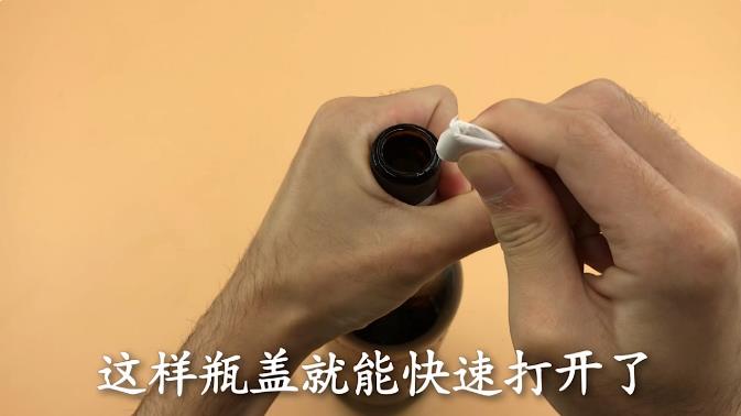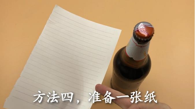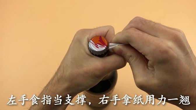 方法四,准备一张纸 将纸折成最硬形状,折成这样就可以了,同样左手握紧啤酒,左手食指当支撑,右手拿纸用力一翘,这样瓶盖就能快速打开了。