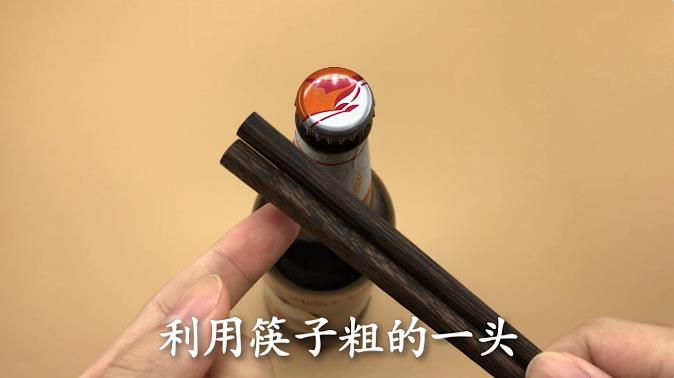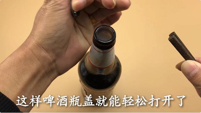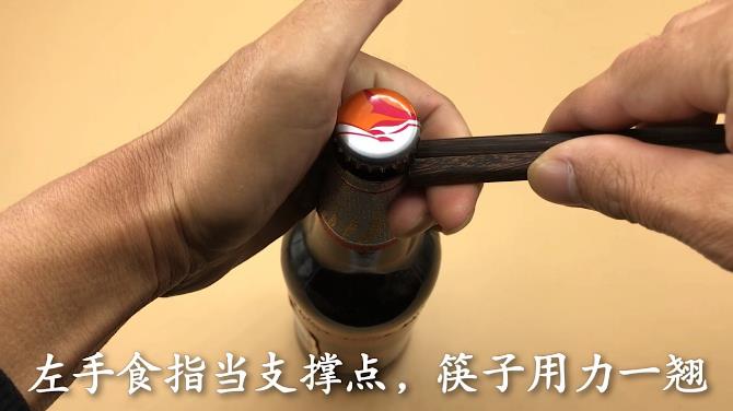 方法一,准备一双筷子 利用筷子粗的一头,左手握住啤酒,右手拿住筷子粗的那头,左手食指当支撑点,筷子用力一翘,这样啤酒瓶盖就能轻松打开了。