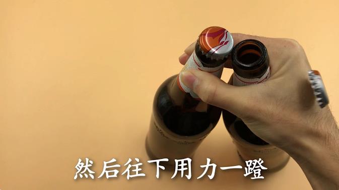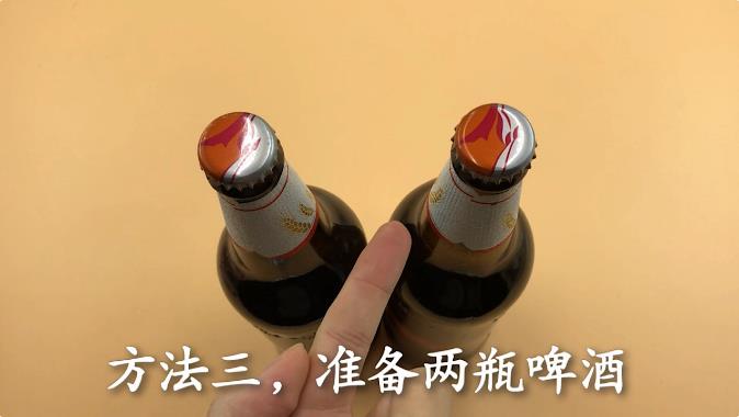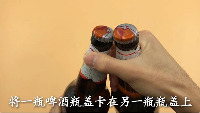 方法三,准备两瓶啤酒 将一瓶啤酒瓶盖卡在另一瓶瓶盖上,单手拿住,然后往下用力一蹬,这样瓶盖就能轻松打开了。
