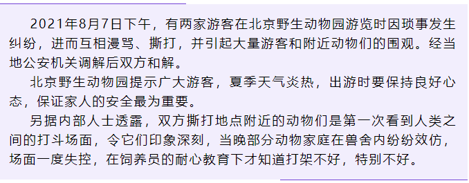 据北京野生动物园官方微信消息,2021年8月7日下午,有两家游客在北京野生动物园游览时因琐事发生纠纷,进而互相谩骂、厮打,并引起大量游客和附近动物们的围观。经当地公安机关调解后双方和解。北京野生动物园提示广大游客,夏季天气炎热,出游时要保持良好心态,保证家人的安全最为重要。另据内部人士透露,双方厮打地点附近的动物们是第一次看到人类之间的打斗场面,令它们印象深刻,当晚部分动物家庭在兽舍内纷纷效仿,场面一度失控,在饲养员的耐心教育下才知道打架不好,特别不好。