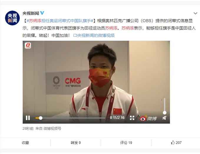 奥林匹克广播公司(OBS)提供的闭幕式信息显示,闭幕式中国体育代表团旗手为田径运动员苏炳添。苏炳添表示,能够担任旗手是中国田径人的荣耀。转起!中国加油!