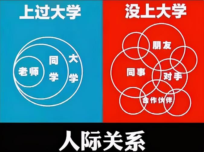 “人际关系”的不同 “人际关系”的不同,也是上大学和没上大学的区别之一。上过大学的学生,他们的交际圈往往都离不开一个整体。就像下图中的那样,大学里包含着同学,同学又连接着老师。层层递进,但都离不开这个大圈子。 没上大学的学生就不一样了,他们的交际圈普遍都比较复杂。有时候,朋友的对手可能都是你同事的合作伙伴。这样的关系在如今的社会中,也比较普遍。