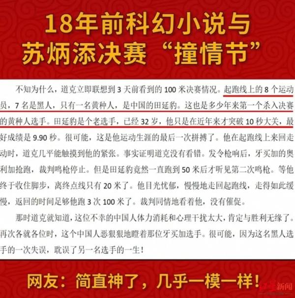 小说中写“老选手32岁”,苏炳添1989年出生,今年恰好32岁;8名参加决赛运动员中,他也正是唯一的黄皮肤;而且苏炳添参与的这场决赛,第一枪的时候,第四道的英国选手抢跑,导致所有的运动员都受到了影响。通过反复对比,发现小说中的情节,与苏炳添的比赛经历竟然惊人的相似。网友们说,居然还有决赛抢跑的情节,“这是穿越文吧!王晋康简直就是预言帝!