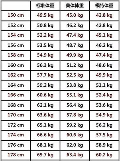 我们作为亚洲人,亚洲人的骨骼体重占比是不一样的。而亚洲人每个年龄人群的人的体重指数也不一样,中老年女性身材保持在体重指数在22.6-27.4之间更对身体有益。 它是有一定公式计算出标准体重的:BMI指数=体重÷身高的平方。实际上成年人能控制自己的标准体重指数在18.5-23.9之间就很好了。但是对于年龄50岁以后的的女性而言,稍微胖一点点更对的身体各项机能更好,所以过瘦或过胖都是不好的。医生公布了最新的标准体重表,大家可以测试一下,看看自己是否健康。