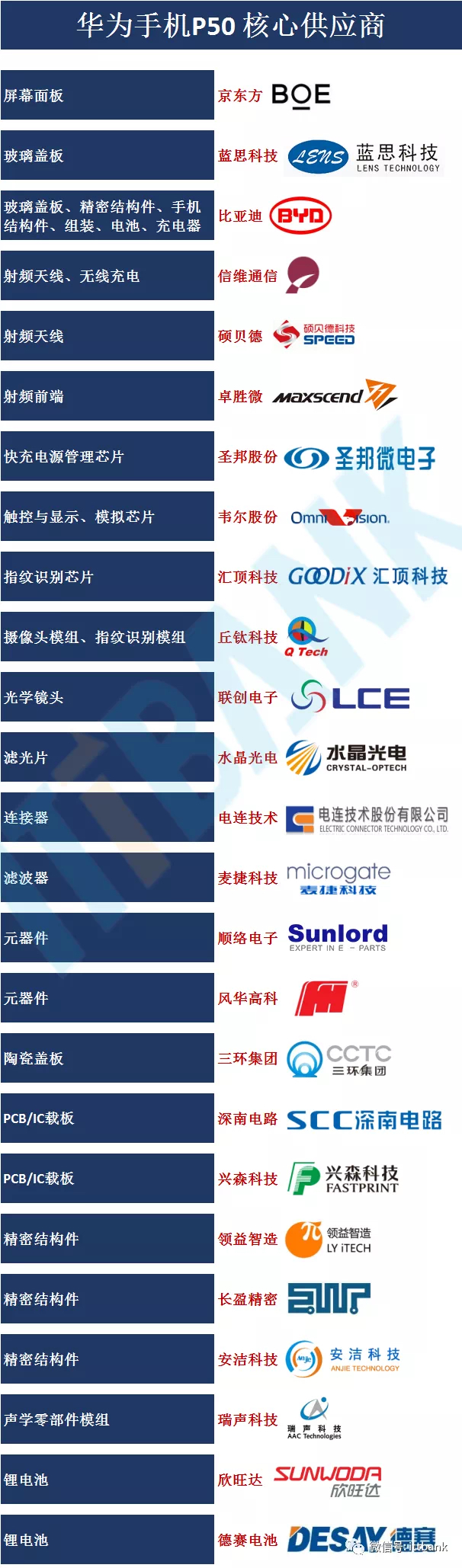 从名单来看,P50的核心供应商包括了像显示屏供应商京东方,电池供应商德赛电池,声学零部件供应商瑞声科技,指纹识别汇顶科技,射频器件卓胜微,以及比亚迪、信维诺、蓝思科技等20多家国内企业,名单中的绝大多数企业之前就是华为披露过的供应商。不可否认的是,华为寻求国产化替代的决心没有改变。不久前,华为海思自研的首款OLED屏幕显示驱动芯片正式试产。OLED 屏幕驱动芯片一直都被韩国企业垄断,华为这颗自研屏幕驱动芯片的试产,也可以说是为了打破长期严重依赖外国企业的被动局面。作为智能手机成本最高的部件,OLED屏幕国内厂商的话语权也非常有限。以京东方、维信诺为代表的国产屏幕厂商与华为的合作,华为自研的驱动芯片配合国产的高端OLED屏幕,可能打开一个全新开端。P50系列上就采用了上述两家国产的类钻石排列屏幕。实际上,从2019年的华为Mate30开始,华为国内供应链厂商占比就变得越来越高。2020年4月,华为消费者BG CEO余承东称,当时华为手机已经完全实现了对美国器件的全面替代。“中国企业能力越来越强,很多东西都可以自己搞定,也给国内厂家更多的机会。在去年曝光的华为P40核心供应商名单中,同样出现大比例国产企业的身影。举例来说,P40系列多款型号的摄像头模组部件来自舜宇光学、欧菲光、立景、丘钛科技、水晶光电等,屏幕方面同样有一定比例来自京东方。 投资布局提速 最近两年,国产手机厂商集体开始重视芯片研发,重视半导体投资和产业链布局。小米不仅重启了自研芯片部门,在半导体的投资布局也没有懈怠,小米半导体企业投资数量接近60家。华为同样在加大该领域的资金投入。有统计显示,华为通过旗下哈勃投资已经投了30多家半导体领域的相关企业,覆盖EDA软件、半导体材料、射频芯片、光刻机等相关多个关键领域,几乎涉及芯片全产业链。2019年成立以来,华为哈勃一路投资提速,并加大涉猎范围和投资力度。截至7月上旬,华为哈勃共投资了18家设计公司、8家材料公司、5家软件公司、3家零部件公司、2家设备公司、1家测试公司、1家IDM(整合元件制造商)。除华为、小米等硬件厂商外,互联网大厂们也纷纷加入进来。近日,腾讯进军芯片领域,虽然目前仅针对特定领域而非通用芯片,但释放出了对于国产半导体的积极信号。“腾讯系”的美团近期也通过投资形式参与芯片领域,其产业基金投资了一家上海半导体公司“智砹芯半导体科技”。另一大互联网巨头,阿里巴巴早于2018年就成立了半导体公司,近日又被曝光关联企业海南云峰基金入股“聚力成半导”,被投资公司的经营范围含半导体科技、新能源科技、电子技术开发服务等。