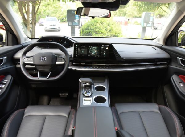 车身部分的造型相对而言比较的简洁和干练,车身的整体风格比较圆润,而且在车身的细节处还有镀铬进行装饰,所以营造出了非常强烈的档次感。车尾部分的设计同样没有让大家失望,辨识度很强的同时也很有看点,看上去非常富有运动气息。尾灯的灯组外壳采用的是透明色调的设计,时尚氛围比较强,再加上还配备了双边双出的尾排,所以对年轻消费者来说,这个设计就很友好。不得不说,全新长安CS55 PLUS的外观设计是很成功的。 接下来我们再来看看内饰之中的表现,除却外观以外,内饰之中的设计完全可以让大家满意。因为全新长安CS55 PLUS的内饰风格采用的同样是长安家族的最新设计,中控台部分的造型明显简洁了许多,所以看上去线条十分舒展,质感也很出众。车内采用的是双色的色调进行搭配,所以年轻感和运动气息也比较强。全液晶仪表盘和悬浮式中控屏并不在同一个平面上,这种小设计也凸显出了这款车在内饰打造上的巧思。 全新长安CS55 PLUS的车身三围数据是4515*1865*1680mm,轴距是2656mm。通过具体的数据就可以看出,全新长安CS55 PLUS的尺寸和车内空间完全可以满足四口之家的使用需求,所以实用性很强。唯一的缺点就在于,车内头顶部分的空间稍微有些局促。因为车内采用了真皮座椅,所以乘坐舒适性也很优秀。而全新长安CS55 PLUS的配置也继承了国产车的高水准,不仅配备了电动尾门、手势识别、面部ID识别,并且车联网、多媒体功能等方面也十分齐全。 全新长安CS55 PLUS在动力上将会继续搭载蓝鲸NE系列引擎,排量是1.5T,最大马力是188匹,传动匹配的则是7挡双离合变速箱。这套动力总成的调校也更加适合城市内代步和驾驶,整体的表现都非常不错,8.5秒的加速成绩相对而言也十分优秀了。底盘采用的则是前麦弗逊式独立悬架+后多连杆独立悬架的组合,完全可以满足日常生活中的使用。