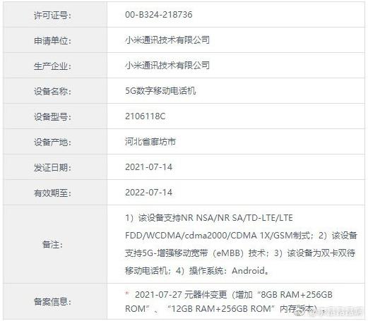 入网信息显示,小米 MIX 4 新增了 8+256GB 和 12+256GB 存储组合的版本,根据此前爆料,小米 MIX 4 将是全球首批上市的骁龙 888 Plus 机型,其核心配置将是目前顶级表现。