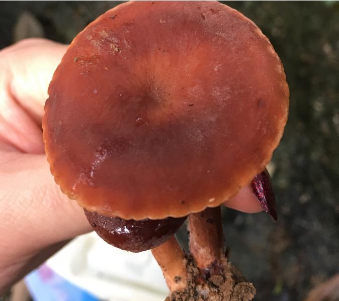第三个,“奶浆菌”,多汁乳菇/Lactarius volemus,红菇科多汁乳菇属,受伤处会流出白色乳汁,故曰“乳菇”。菌盖初生时扁半球形,中间明显下凹,暗红色或琥珀色。以初秋稻谷成熟之时为多,亦俗称谷熟,菌肉脆香可口,生吃微有甜味。同科同属还有几个相近种类,如多皱乳菇等,统称“奶浆菌”,略。