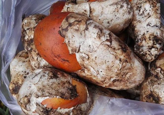 第九个,“鹅蛋菌”,拟橙盖鹅膏菌/Amanita caesareoides,因幼时形似鹅蛋而得名,如图。菌盖呈亮橙色,设色极为艳丽,看似有毒实则无毒,比见手青之类安全得多。食用时将图中的白色“菌包”剥下,只吃橙黄色的菌体,口感味道类似草菇。切记,鹅膏菌类多剧毒,不建议自行采食类似菌子,在正规市场购买较为妥当。