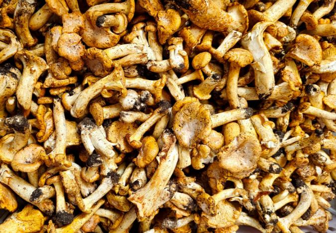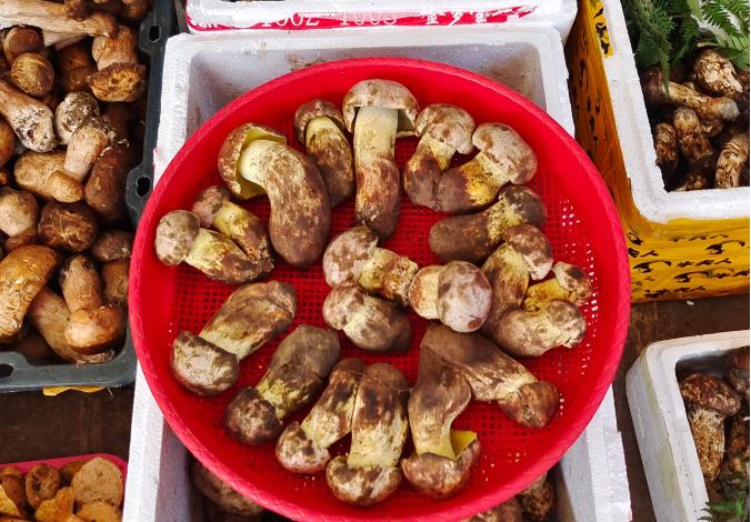 第三个,“鸡油菌”,云南鸡油菌/Cantharellus yunnanensis,色如母鸡肥油,子实体呈肉质喇叭形。鸡油菌科鸡油菌属在我国有30多种,往往以“鸡油菌”统称之,但云贵两地产量最大的“鸡油菌”为独立种,真正的鸡油菌/C. cibarius仅产于吉林。具体区别非常细微,一般人难以分辨,不管是哪个种吧,“鸡油菌”都是一样的好吃、安全。