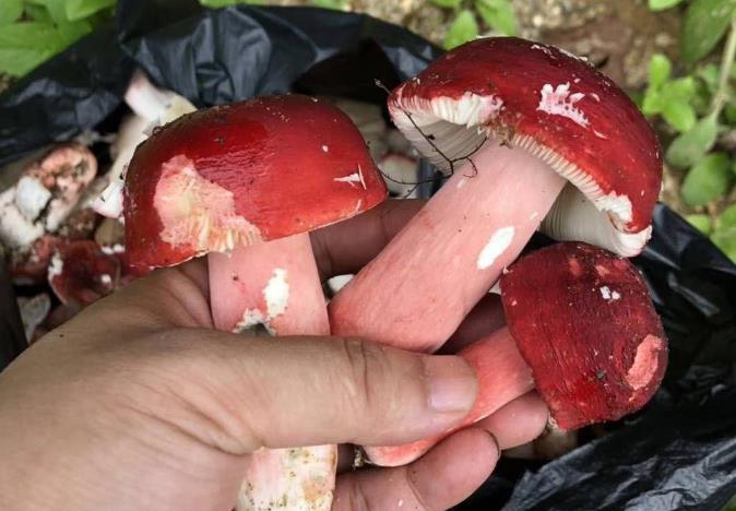 第二个,“大红菇”,灰肉红菇/Russula griseocarnosa,菌盖深红色,曾被误认为是正红菇/R. vinosa,2009年在我国被记录为新种,因菌柄断面灰色,故名“灰肉”。该种和“青头菌”同科同属,模样差不多,起初都是饱满型,后期伞盖变扁伸展,中部稍下凹。具水果芳香,味甜,干制品煲汤尤佳,汤色亮红、口味清甜。