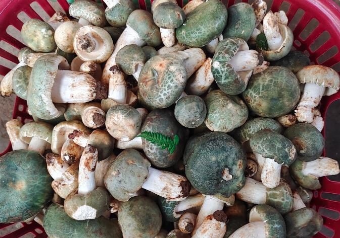 第一个,“青头菌”,变绿红菇/Russula virescens。明明是红菇科红菇属的种类,却偏偏一脸葱茏。初生时菌盖饱满、珠圆玉润,颜色浅绿或灰绿,好似发霉的过期食物,但该种完全无毒,人畜无害,且口感脆嫩,香气浓郁,在云南野生菌中属于“温良贤淑”之类型。无需复杂烹饪,单是“青头菌盖饭”就令人垂涎三尺。