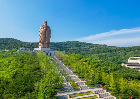 孔子圣像位于尼山圣境主轴线最北端的一处高地之上。圣像坐北朝南,面向孔子湖,像高72米,基座高度为18米,加在一起则高达90米,相当于30层楼的高度,是目前世界上最高的孔子塑像。 孔子铜像面部形象宽容、厚重,服装简洁均衡,由著名雕塑家吴显林先生主持设计,以唐代画家吴道子《先师孔子行教图》为参考,按照“可亲、可敬”、“师者、长者、智者”的形象定位进行塑造,统领尼山圣境文化空间制高点。