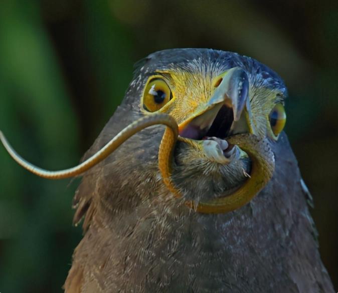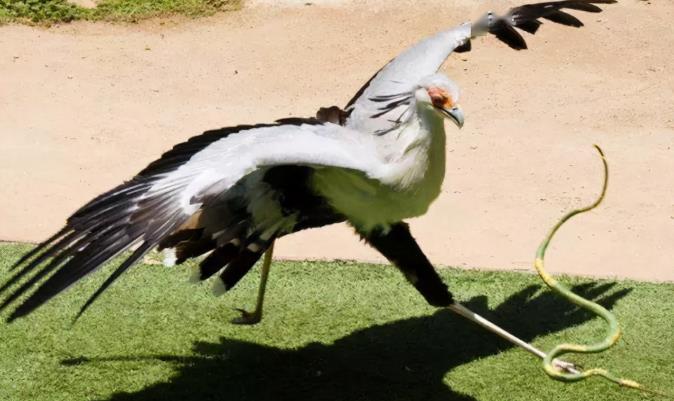 蛇鹫会利用自己腿长的优势,不断的挑衅着面前的蛇类,引起蛇类的反击,并且不断的拍打着翅膀以及来回踱步。蛇类属于变温动物,也就是我们所说的冷血动物,它们有一个缺点就是体力很快会被耗尽。 接下来就是属于蛇鹫的攻击时间,蛇鹫继续利用自己大长腿的优势,不断的用脚掌攻击蛇类的头部,几掌下去就能够将蛇类击晕,严重的可能颈部骨折,当场死亡。之后蛇鹫就会像吃长寿面一样,直接将蛇整条吞下。 蛇鹫的优势就是大长腿以及较高的身体,大长腿不仅是有力的进攻武器,同时腿上还有一层厚实的角质鳞片,能够防御蛇类的咬击。蛇鹫高大的身躯能够给予蛇类压迫感,同时还能够观察蛇类的动向。蛇类在蛇鹫的面前简直毫无反击之力。 蛇雕 要说蛇类的克星,鹰类和雕类绝对要占据其中之一,而在鹰类和雕类当中,蛇雕更是令蛇类头疼的存在,因为蛇雕的主要食物就是以蛇类为主。 蛇雕对于蛇类有一手,它会先在天空当中翱翔,当发现蛇类时,它会从天空当中立即飞下,从蛇类的后方进行攻击,牢牢抓住蛇类的身体以及头部,然后不断的用锋利的喙啄蛇类的头部,直至蛇类失去防抗能力。 对于体型较小的蛇类则是直接用强大的咬合力咬碎蛇类的头骨,然后直接一口闷。 对于体型较大的蛇类,那么则是一场体力的对抗,蛇雕同样会抓住大型蛇类的身体以及脖颈处,此时大型蛇类会不断地进行挣扎,蛇雕则会将蛇抓上高空,直到蛇类精疲力尽,如果蛇类挣扎剧烈,则直接从高空当中丢下。