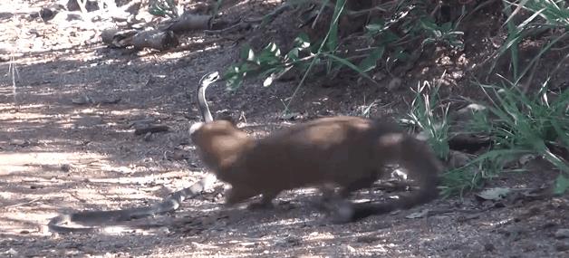 蛇类在蜜獾的眼中就像是一根大香肠,因为常年与非洲的毒蛇打交道,令蜜獾的身体当中也出现了蛇毒抗体,能够减弱蛇毒的毒性,同时减弱蛇毒的症状。 蜜獾的抗体对付带有神经毒素的蛇类更为有用,蜜獾与毒蛇大战之后,往往也会遭到毒蛇的咬伤,此时蛇毒对于蜜獾的作用则是另其身体麻痹,所以就出现了蜜獾躺在地上睡一觉以后就没事了的状态。 毒蛇常常遭到蜜獾的捕食,但是大体型的蟒蛇却时常有反杀蜜獾的事件产生,毕竟勇气不能当饭吃,实力才是王道。 蛇獴 说到蛇类的天敌,就不得不提“捕蛇一哥”——蛇獴,这才是蛇类遇到之后会瑟瑟发抖的存在,在蛇獴的面前,蛇类统统会绕道而行。 蛇獴体型较小,体型与小型犬差不多,不过蛇獴擅长的就是以小博大,常常捕杀被自己体型大上几倍的毒蛇,特别是眼镜蛇。