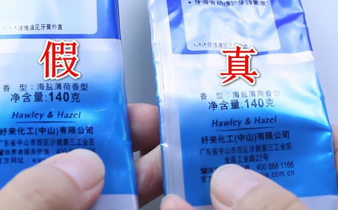 辨别牙膏真假的小妙招二:看牙膏的生产地址 正规生产的牙膏,牙膏背面都会有生产厂家的具体生产地址,可以具体到某路多少号;左边的这个假牙膏只是写了某区,具体多少路多少号并没有写,牙膏生产地址越具体,越能说明是正品的牙膏,大家可以通过看牙膏的生产地址来辨别真假。