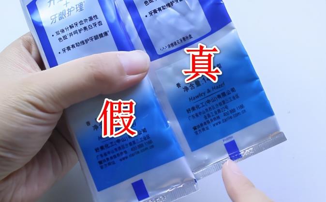 辨别牙膏真假的小妙招一:看牙膏的“颜色条” 你看这两支牙膏,无论是形状大小,还是字母和颜色,几乎都是一模一样的,普通消费者是很难辨别真假的。首先我们可以通过看牙膏的“颜色条”来辨别,一般在牙膏背面的底部都会有这样一个“颜色条”,牙膏底部“颜色条”是用于牙膏生产过程中产品封尾时的定位与识别,常用的颜色有红、蓝、绿等。