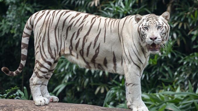 (2)雪虎 另外一种遗传条件可能导致老虎完全没有条纹或条纹很淡,使得它们身上几乎呈现纯白色,这个结果可能是由于同一家庭成员的近亲繁殖造成的。这种白色品种的老虎非常罕见,只能在人工饲养中观察到。