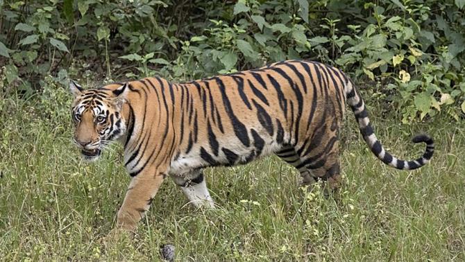 2、孟加拉虎 最近,孟加拉虎被认为是现存最大的野生老虎亚种,虽然这个观点还有待商榷,但可以肯定的是,它们仍然是现存数量最多的亚种,大约有2967只成年老虎。孟加拉虎的皮毛有黄色和浅橙色,条纹则呈现深棕色和黑色,四肢内侧和腹部为白色,尾巴为橙色并带有黑色环形。
