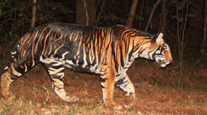 (4)黑虎 黑虎是老虎的一种罕见的颜色变体,并不是一个独特的物种或地理亚种。所谓的“黑虎”只是一种“伪黑化”。黑虎身上的黑色条纹很宽且非常接近,以至于在条纹之间的黄褐色皮毛几乎都看不见。无论是在野外还是在动物园里,我们都可以看到这种稀有的动物。
