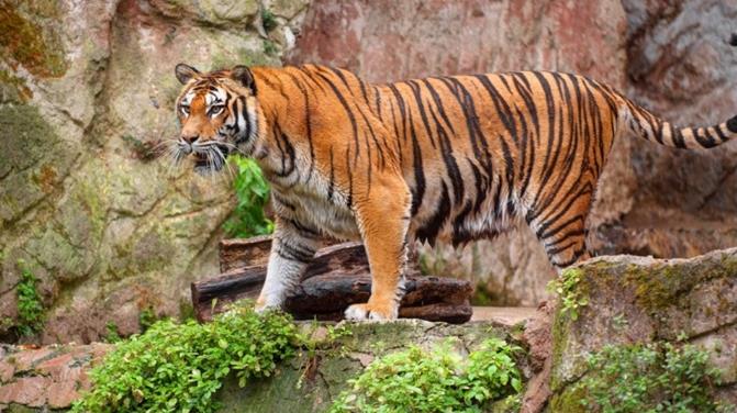 4、马来亚虎 马来亚虎的身体是橙色的,身上分布着黑色的条纹。眼睛周围、脸颊和腹部可以看到白色的毛发。它们黑色条纹比其它老虎亚种的条纹要细,为它们在丛林中猎食提供了完美的伪装。