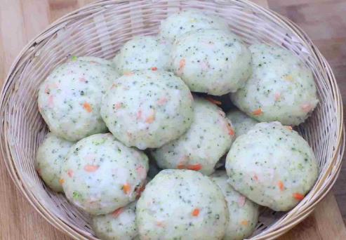 【蔬菜馒头】 1.首先,我们准备洗净的胡萝卜半根,切成小丁,西兰花一朵,用刀把表面的小花蕾片下来,把它们放在同一个盆中,加入面粉150克,玉米面100克,放入米酒20克,酵母3克,无铝泡打粉2克,白糖3克,促进酵母发酵。 2.用温水和面,少量多次的添加,搅拌成一个粘稠的面团,用锅盖盖住,密封发酵1个小时。 3.1个小时以后,面团已经发酵至两倍大,内部呈现蜂窝状,我们多搅拌一会,把面团里面的空气排出去。 4.然后准备一个蒸笼,铺上湿布,在面团上撒少许干面粉,防止沾手,取适量面团,在虎口处团成小圆球,摆放在蒸笼里面,不要摆的太密集,防止蒸熟后膨胀粘在一起。 5.全部团好以后,我们开始蒸制,水烧开以后,把笼屉摆放在上面,盖上锅盖蒸15分钟。 6.15分钟以后关火,再焖上2分钟,热气散尽以后,再打开锅盖,把小馒头取出,摆放在盘中即可。