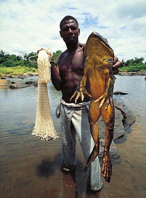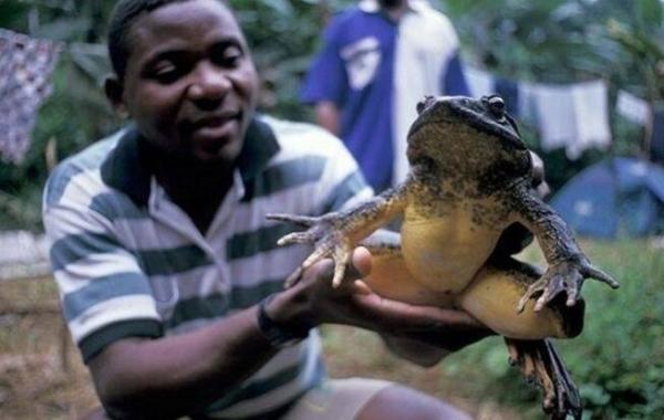 青蛙泛指两栖纲、无尾目、蛙科的两栖类动物,它们在地球上分布得非常广泛,在七大洲之中除了南极洲之外都有青蛙的踪影,虽然世界各地的青蛙的样子都长得大同小异,但不同种类的青蛙,其体型却相差很大。 在地球上已知的青蛙之中,体型最大的是“巨谐蛙”(Conraua goliath),“巨谐蛙”又被称为“非洲巨蛙”,这种巨型青蛙体重可达6斤多,从嘴部到尾部的躯干长度可达32厘米,而如果“巨谐蛙”的腿完全伸直的话,那么它的体长就可以达到1米左右。 只是看数据,估计大家没有什么感觉,我们不妨来看两张图片感受一下。