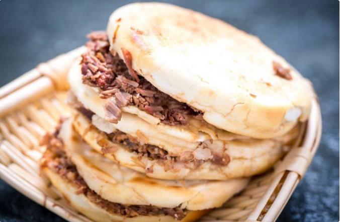 陕西人的凉皮以酸辣香为主,看似红红的辣椒油,其实一点也不辣,很多人几乎每天都要吃上一碗凉皮,早餐,午餐,晚餐皆可。凉皮除了好吃之外,当然价格也很便宜,在宝鸡一碗凉皮3.5元-4元之间,而省城西安价格要贵一些,差不多5元左右。 肉夹馍 肉夹馍可是陕西特有的美味,尤其是潼关腊汁肉夹馍,那可是令人垂涎欲滴,金黄酥脆的烧饼,加上软烂香浓的腊汁肉,那滋味别提有多解馋了。很多人好奇为啥肉夹馍不叫“馍夹肉”,其实它最早是来自于古汉语“肉夹于馍”,但是这么叫实在很麻烦,便简化成了肉夹馍。