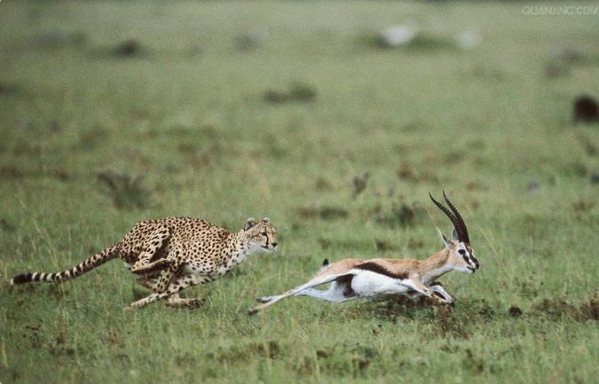 3.陆地上奔跑最快的动物——猎豹。 猎豹狩猎时奔跑的速度最快可超过每小时120公里,但是如此快速的奔跑只能维持几百米,是短跑型“选手”。