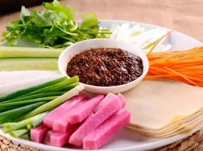 蔬菜蘸酱 在东北,只要是能生吃的菜,都可以蘸酱来吃,例如生菜、大葱、黄瓜、西红柿等,虽然东北人吃起来津津有味,但是南方人却接受不了。其根本原因就是酱的不同,在东北所使用的酱都是咸口的,而南方人更偏向于甜口的甜面酱,因此东北大酱也不受南方人欢迎。