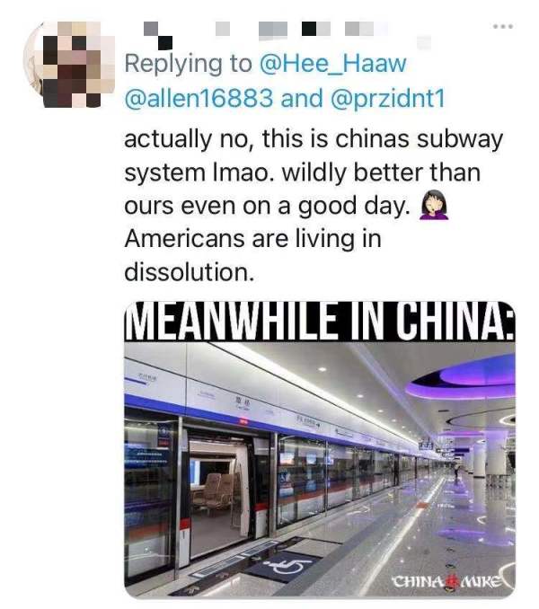 结果,这种言论连美国网友都看不下去了。一个地址显示在得克萨斯州的网友晒出了一张整洁明亮的中国地铁站图片,配文称:“并不是,这才是中国的地铁系统。笑死我了,就算在好天气里,这也比我们的强多了。美国人活在幻觉中。
