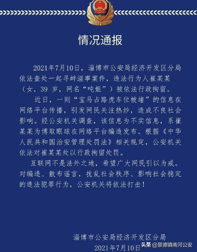 山东淄博市公安局经济开发区分局,查处了一起寻衅滋事案件,依法对崔某某(女,39岁,网名“吨姐”)处于行政拘留。这意味着,“女司机堵宝马158天”的事件真相大白,系吨姐“自导自演”。吨姐为了博取眼球,编造故事哗众取宠,没有底线。更气人的是,各大网络博主信以为真,纷纷支持吨姐的行为。殊不知,我们的善良被她当成了获取流量和赚钱的工具,被她当猴耍,让人感到恶心。