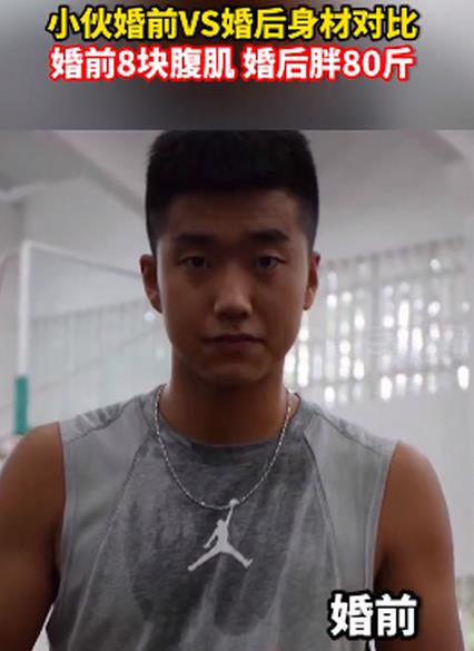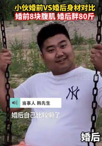 辽宁朝阳,一男子晒出自己婚前婚后的对比图,简直判若两人。婚前他拥有八块腹肌,婚后他胖了80斤。他表示,自己婚后很懒,下班回家比较晚,晚上又吃饭,所以从150斤胖到了230斤……这……这大概就是幸福肥吧!
