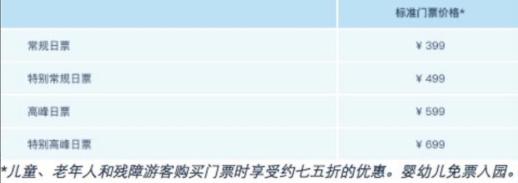 上海迪士尼度假区官网发布消息,自2022年1月9日起,上海迪士尼度假区将在现行四级票价结构下调整上海迪士尼乐园的门票价格,各级定义及对应的票价如下: “常规日”门票价格为435元人民币,涵盖大部分平日和部分周末; “特别常规日”门票价格为545元人民币,涵盖部分周末和部分平日; “高峰日”门票价格为659元人民币,涵盖夏季大部分日期、部分中国法定节假日放假和调休期间及其前后部分日期、国际性节日庆祝期间、乐园特别活动日以及其他客流高峰日; “特别高峰日”门票价格为769元人民币,涵盖部分中国法定节假日放假和调休期间、乐园特别活动日以及夏季部分日期。 其中,儿童(3周岁至11周岁,含3周岁和11周岁;或身高1米以上至1.4米)、老年人(65周岁及以上)和残障游客(需提供残障证明)购买门票时将继续享受约七五折的优惠。婴幼儿(3周岁以下或身高1米及以下)仍可免票入园。上海迪士尼乐园将继续提供90天滚动价格日历,以方便游客根据各自的不同需求进行选择,提早规划行程。 而现行的上海迪士尼乐园票务方案为(适用日期至2022年1月8日):“常规日”门票价格为399元; “特别常规日”门票价格为499元;“高峰日”门票价格为599元;“特别高峰日”门票价格为699元。 上海迪士尼乐园的现行票务方案如下(适用日期至2022年1月8日)