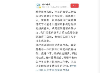 科学角度来说,疫苗的大型三期临床研究是双盲对照试验,样本量巨大,需要有一定的感染流行和病例情况下才能看出疫苗组和安慰剂组的组间差异,从而证明疫苗的保护力。我们国家的强有力的抗疫综合措施取得了成效,也确实实现了几乎没有感染者。 这种话语被网友说成凡尔赛,其实需要每一位以实际行动支持抗疫的你,戴好口罩、做好社交隔离、不随地吐痰、及时接种疫苗、谢谢所有的各行各业参与抗疫的工作者,以及以实际行动支持抗疫的你们。